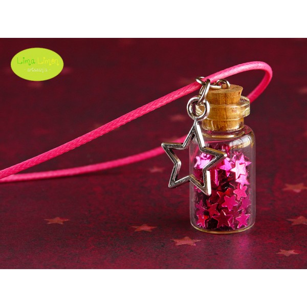 Colgante de tarrito de cristal con estrellitas metalizadas fucsia, con adorno plateado de estrella. Cordón fucsia incluido, de unos 50-60 cm; también puede ir con cadena plateada si lo prefieres. Tapón de corcho de alta calidad, de una sola pieza. Coméntanos tus preferencias en un mensaje.